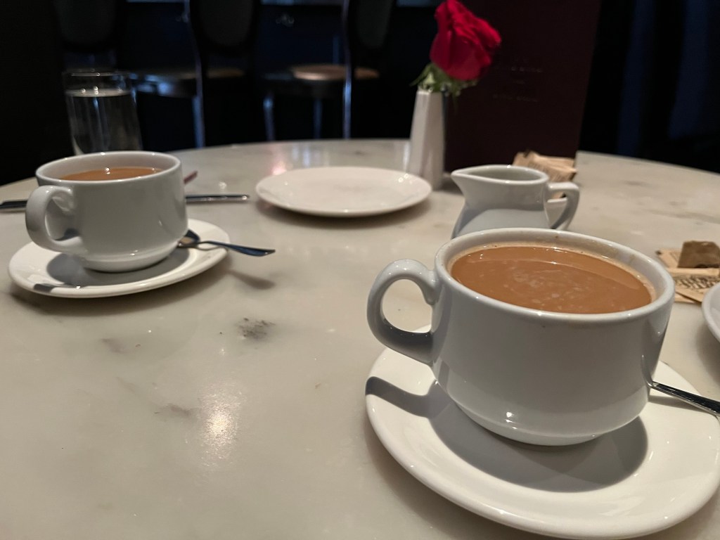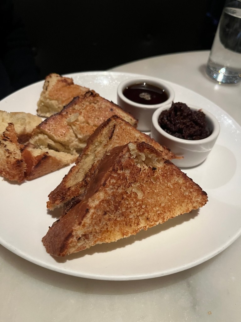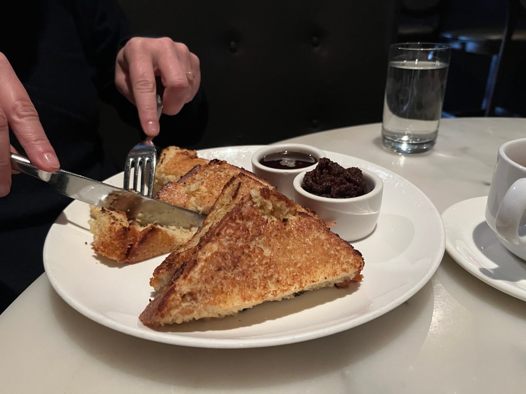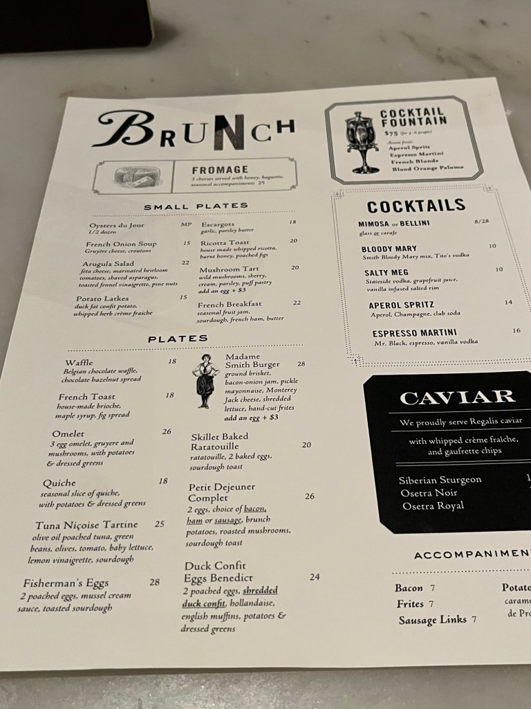 Dinner entrees include fish & chips, the burger two ways, tilefish, Moules Frites, or chestnut agnolotti for about $30. There’s pork chops, duck cassoulet, or Dover sole in the $50-60 range. And there’s a Dove Sole Meunière for a whopping $85. That’s a lot of clams for a piece of fish. For about the same amount, you can tuck into a New York Strip, boneless ribeye, or Wagyu Bavette. Or splurge on the $135 Porterhouse for two. Did I mention the sides are… on the side? As in not included. Things like that make the dinner menu a little daunting for everyday use, which is probably why we usually end up here at brunch.