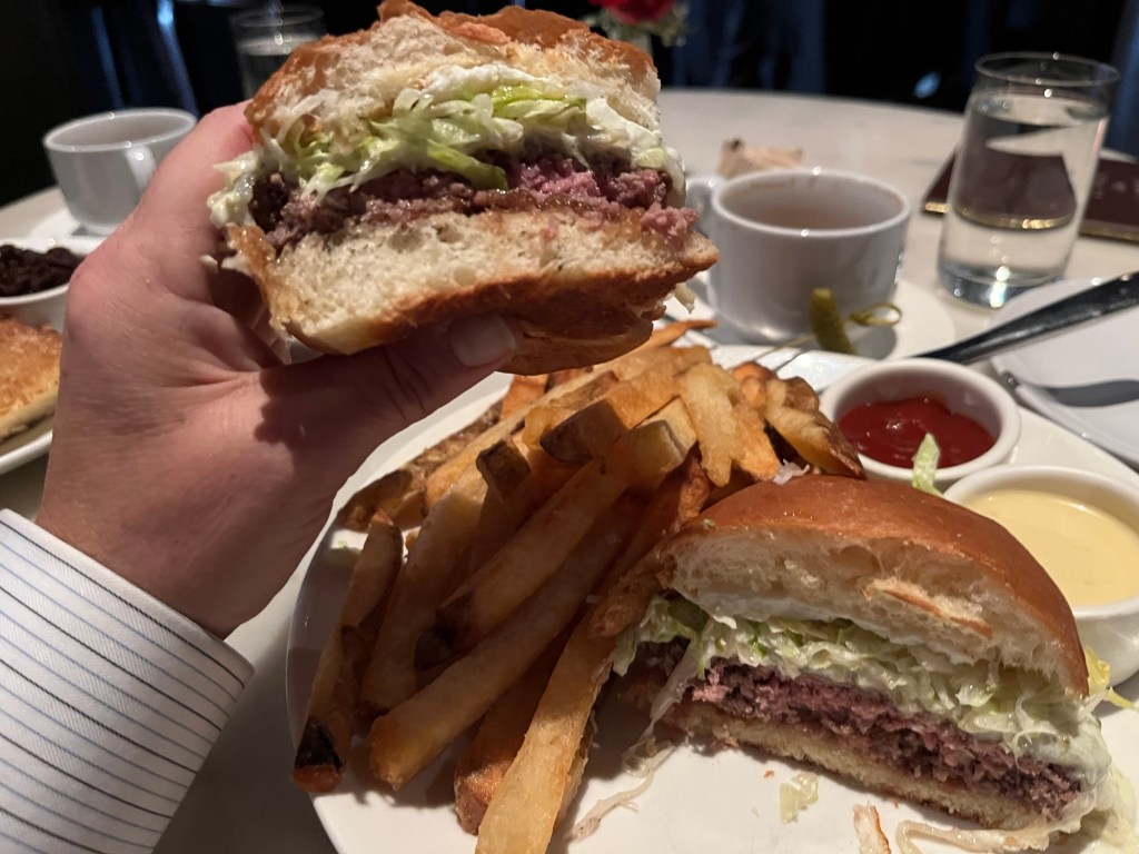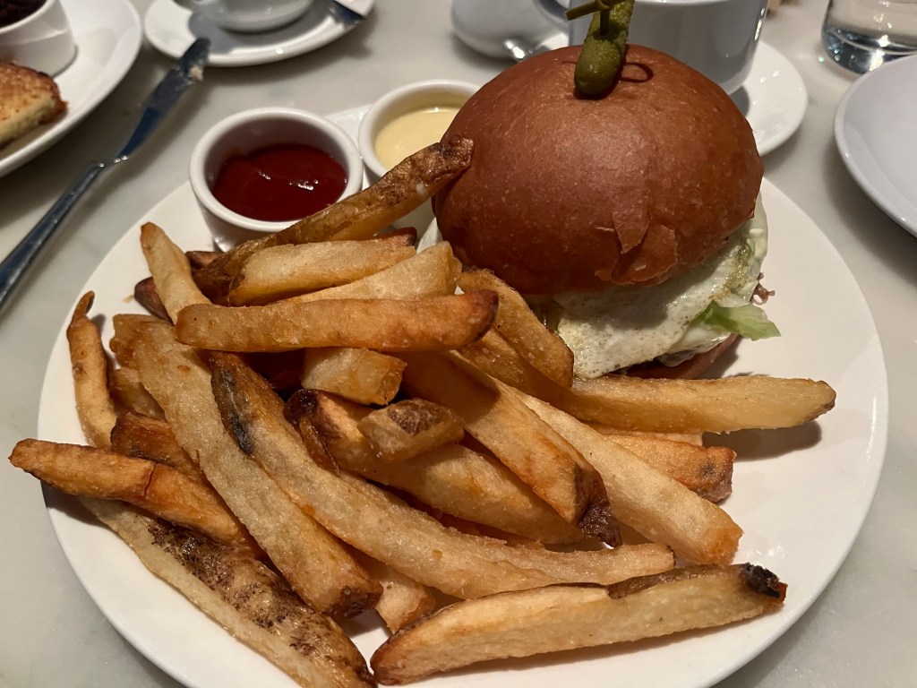 My burger was perfectly cooked with cheese and shredded lettuce all blooming into the pillowy brioche bun. Their special sauce was a house made Dijon aioli, pairing perfectly with the thick-cut, golden-brown fries. The egg on top didn’t have the gooey yolk I wanted running down the sides, but that’s probably my fault for ordering it over hard instead of over medium. I wanted it somewhere between no goo at all and running down my hand onto my French cuffs, but I don’t think I communicated that wish fully. So, it was too hard.