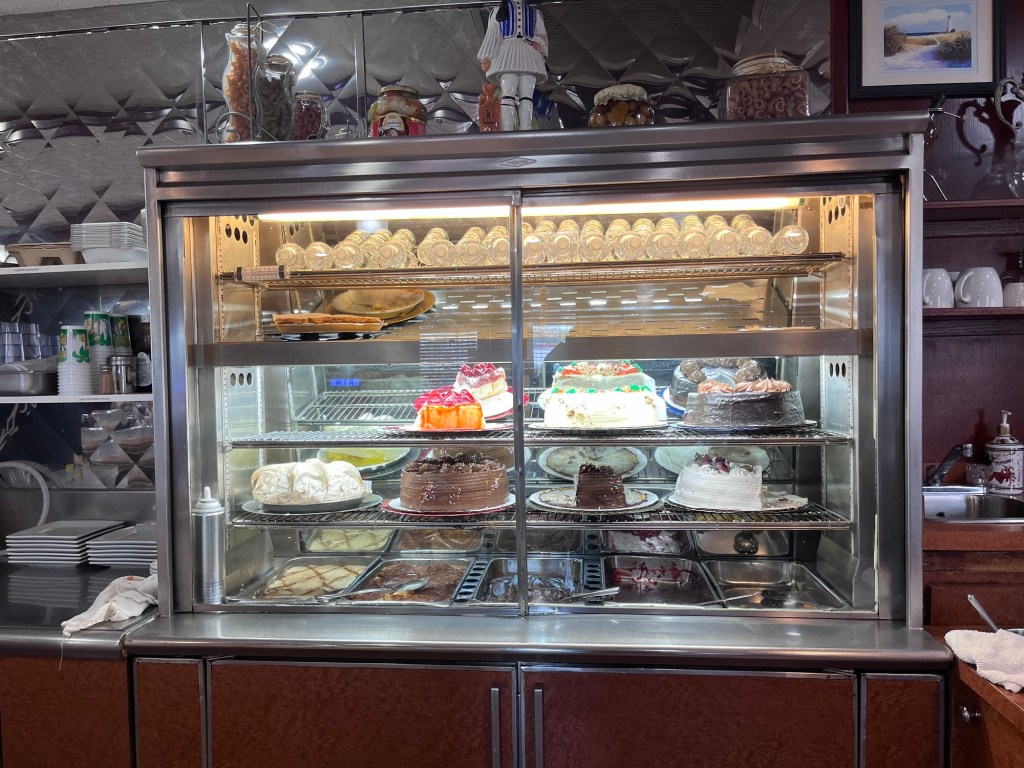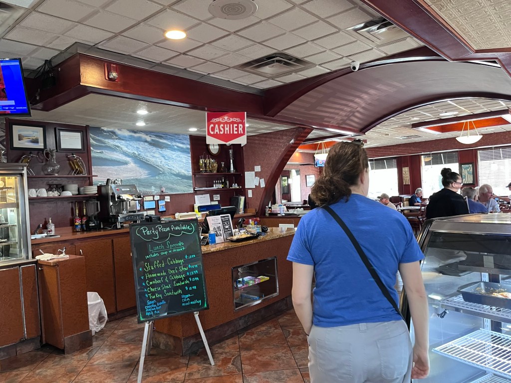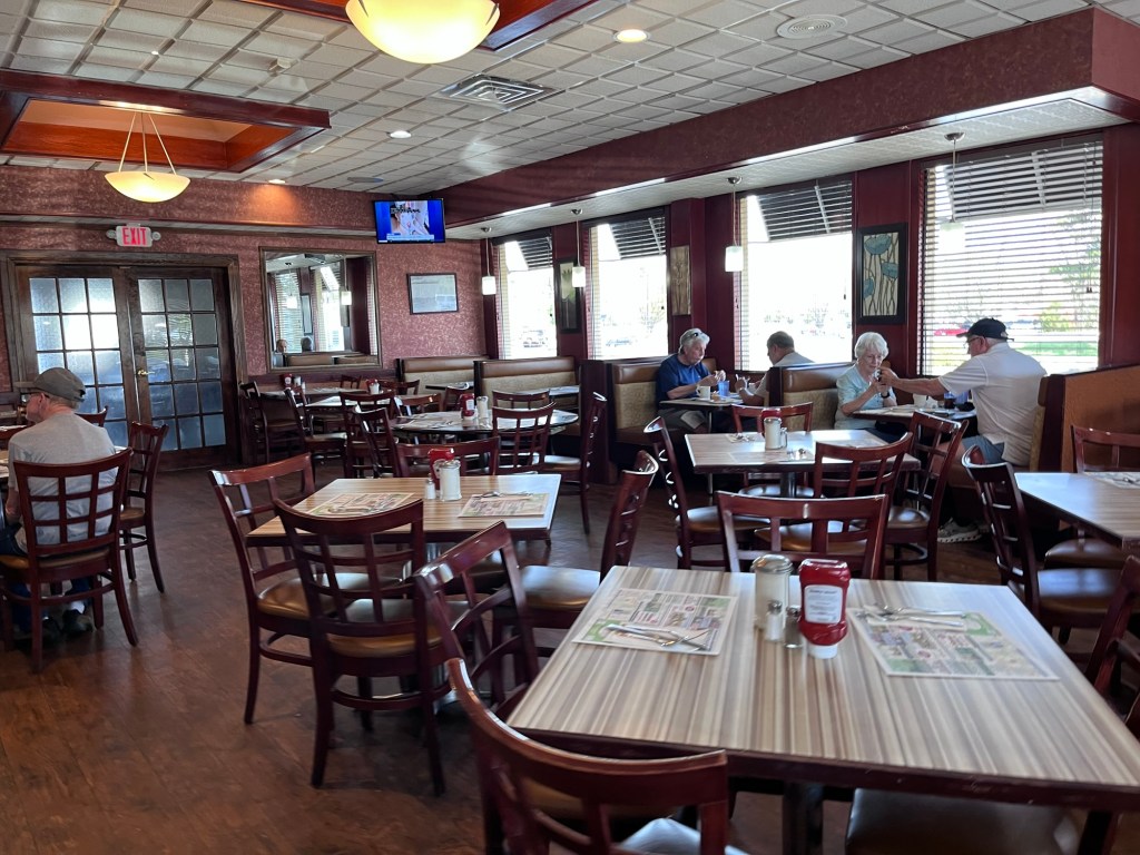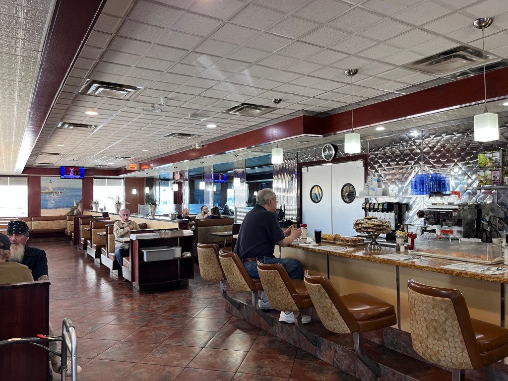 It’s a little rough navigating the pothole ridden parking lot and it looks a little dated on the exterior. But the interior is a classic chrome diner style with one side of the finer open booths, limited counter seating in the middle, and tables on the left. Their website notes that it has recently be renovated. A big case of cakes sits behind the cashier station.