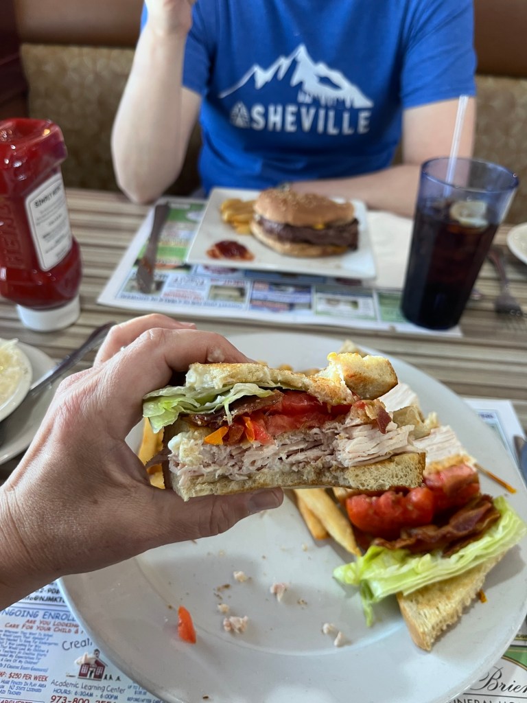 Slaw and pickles come out with the drinks; 10 minutes later our meals are on the table. J’s burger is huge and very juicy. My TBLT club is loaded with white meat turkey, crispy bacon, and deliciously ripe tomatoes‚—better than I’ve seen at any diner before. Our fries are crispy and even the slaw is good although a bit sweet.
